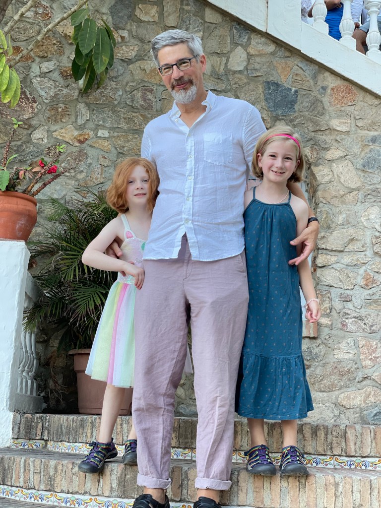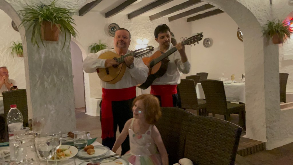 Flamenco, which Annika kept thinking was called Flamingo, is the traditional music and dance of Andalucia. There are concerts and performances throughout the summer, but usually starting at 10:30 pm, which still seems too late for our kids. We found a dinner and performance that begins at 8:30, so we made reservations, had the kids take a siesta (they rested, but still can’t fall asleep for a real nap), and arrived early, thinking it started punctually. We were treated to a 10-course meal for EUR 37 per adult and 17 per kid (the Euro and dollar are at almost parity now, so these prices are also in dollars). What we didn’t know was that the performance begins after everyone has eaten, and many diners didn’t show up until 10pm. The kids took a nap on our laps. When we left at 1 AM after a beautiful performance that the kids wanted to see through until the end, we took a drive through town on our way home, and saw many people strolling around the boardwalk, ranging from grandparents to tots in strollers.